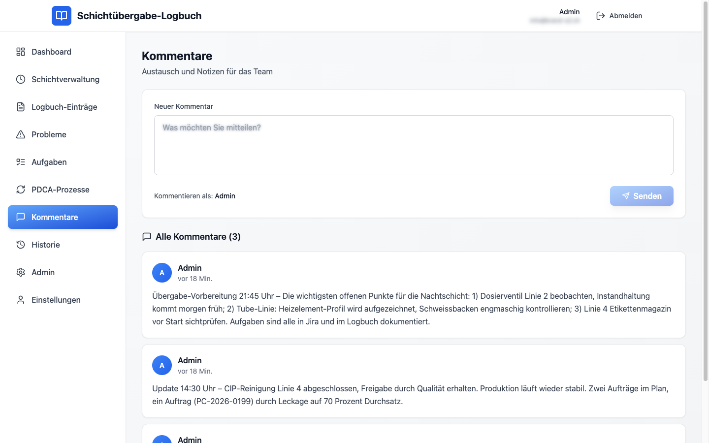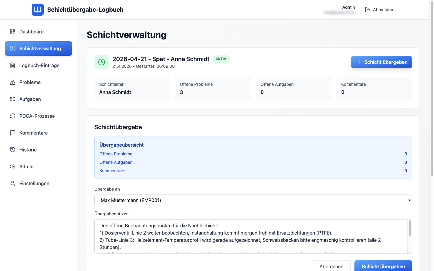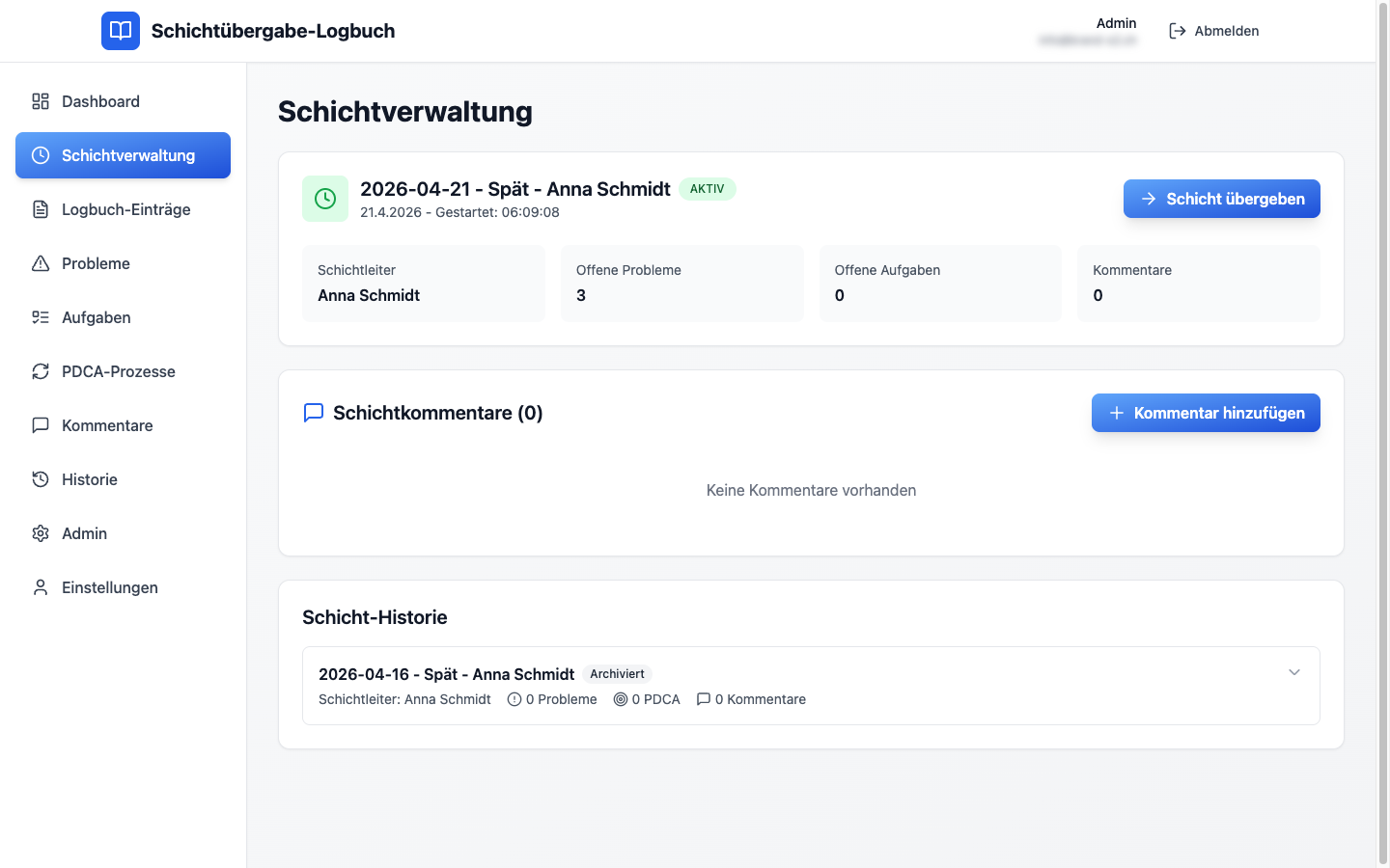 Jede Schicht hat einen klaren Start, einen definierten Schichtleiter und ein Ende mit dokumentierter Übergabe. Sie sehen sofort: wie viele Probleme, wie viele Aufgaben, wie viele Kommentare sind noch offen. Darunter die komplette Schicht-Historie als Archiv.