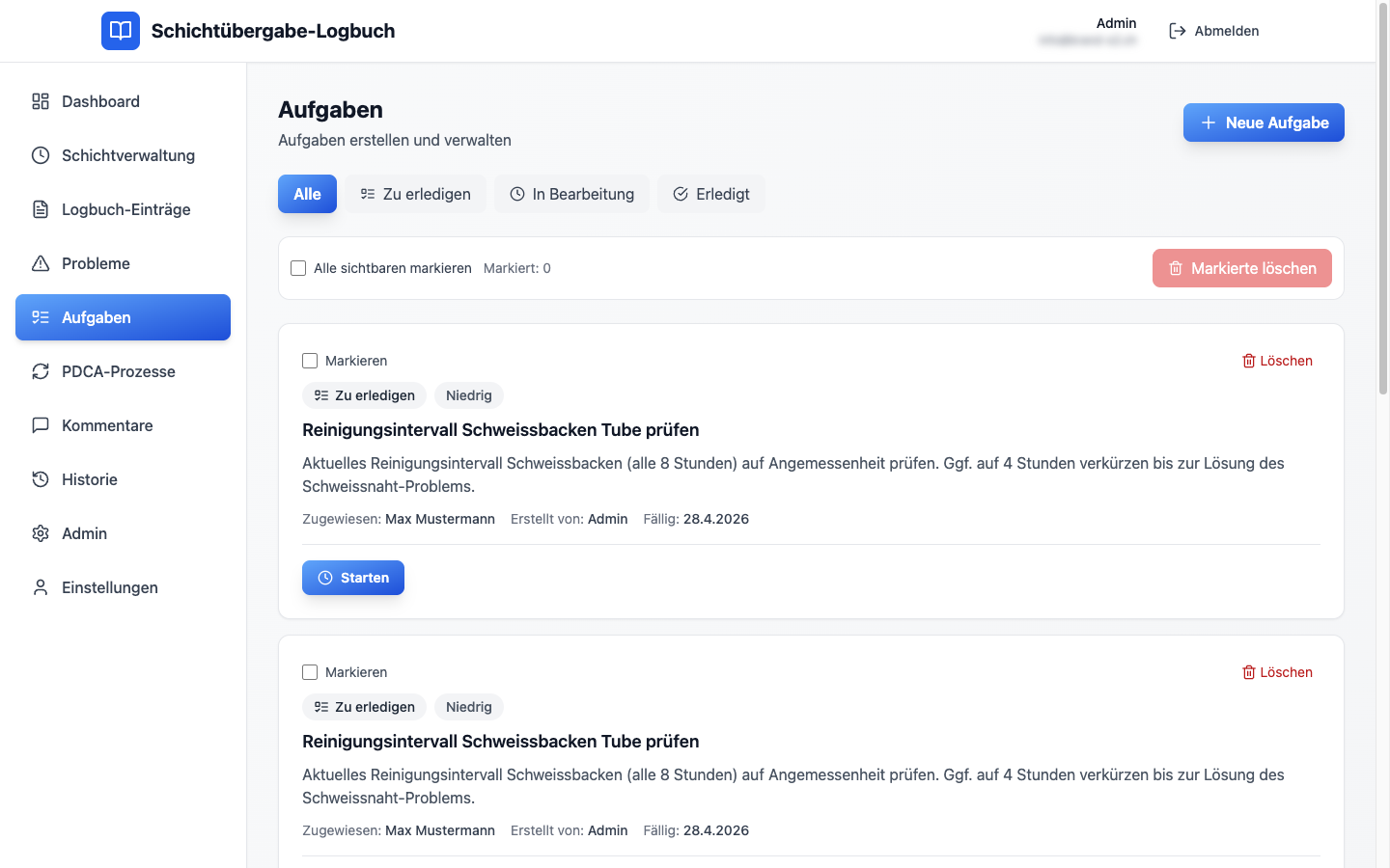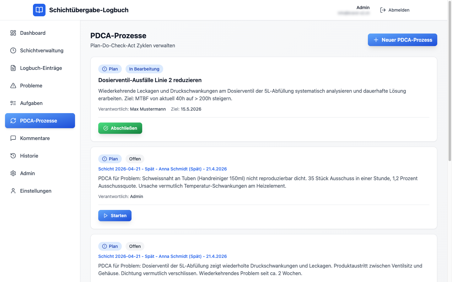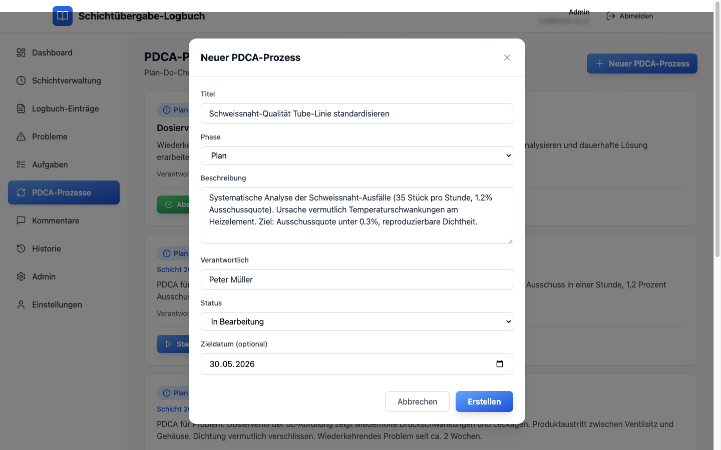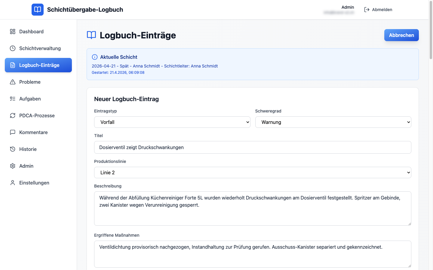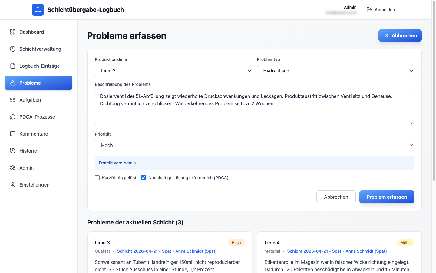 Der Schichtleiter wählt Datum, Schichttyp und seinen Namen aus der Auswahlliste – fertig. Ab jetzt laufen alle Einträge, Probleme, Aufgaben, PDCAs und Kommentare unter dieser Schicht. Ohne Doppel-Erfassung, ohne Medienbrüche.