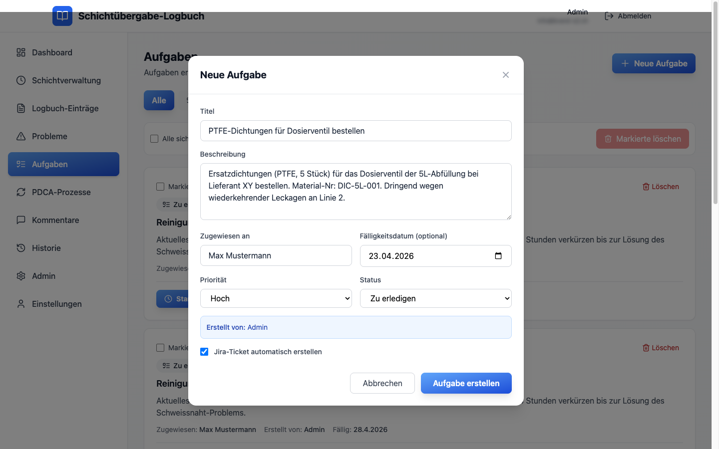 Jede Aufgabe hat einen Titel, eine Beschreibung, einen Zugewiesenen, eine Fälligkeit und einen Status. Überfällige Aufgaben werden automatisch rot markiert. Und der entscheidende Unterschied zu jedem anderen Logbuch: per Checkbox wird aus der Aufgabe ein Jira-Ticket.