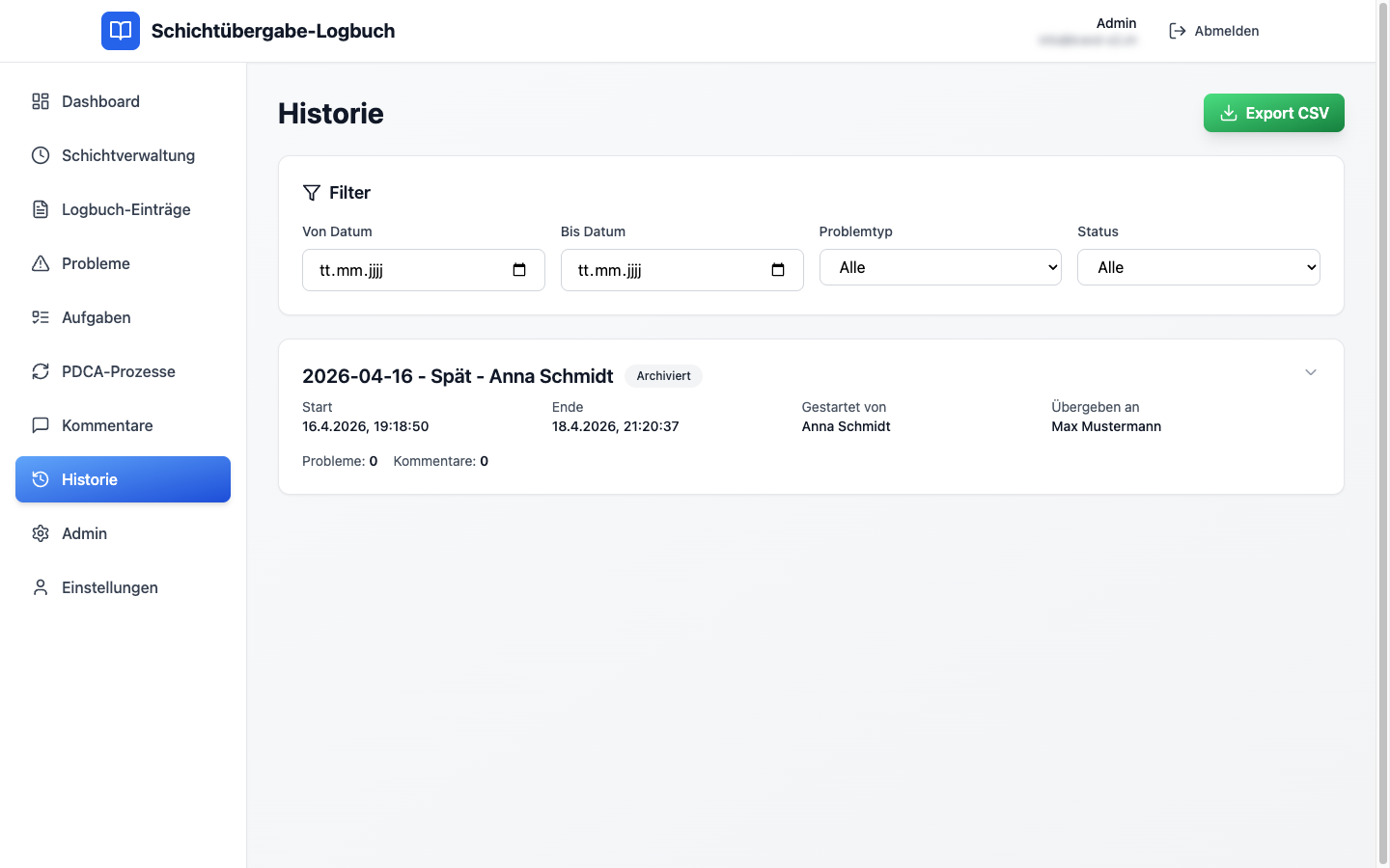 Alle archivierten Schichten mit Filter nach Datum, Problemtyp, Status – CSV-Export für Reporting.