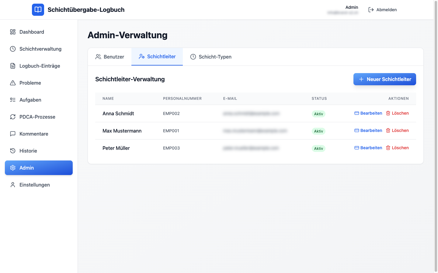 Zentrale Verwaltung: Administratoren, Schichtleiter inkl. Personalnummer und E-Mail, konfigurierbare Schicht-Typen.